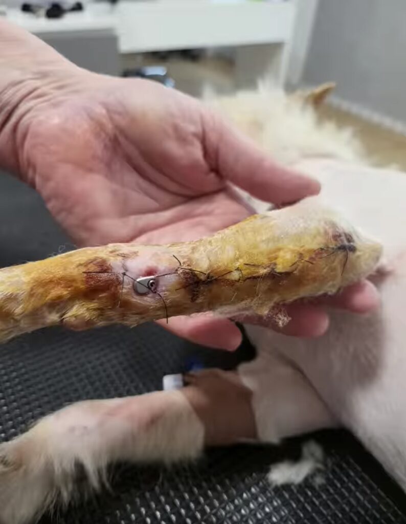 Přední noha špatná. Viz foto. A rovnou ji paní doktorka amputovala. Ač jsme toto všichni tušili, věřili jsme a první dny to vše vypadalo nadějně. Ale nedopadlo.