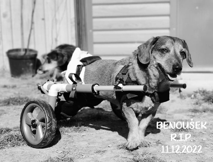 Benoušek byl pan pes, introvert, avšak když si člověka zamiloval, zahrnul ho tak nesmírnou láskou. Na fotce je na vozíku, ale raději byl bez, v jeho pyžamu.