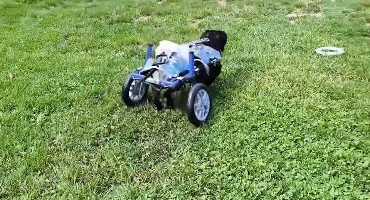 Teď si něco povíme jo, sice ani po více jak měsíci od operace po intenzivních rehabkách nechodí, ale snahu má, mrtvé nohy nemá, tož zkusíme. Sice od některých veterinářů, bohužel i odborníků uslyšíte, nedávalejte vozík…houby. Když se k nám dostane rafánek v takovém stavu (že po operaci nechodí), ale kde je naděje, tak dáme vozík vždy a upravíme ho tak, aby zadní nohy dosáhly na zem a rafánek je mohl používat. A tady vidíte… Ten ruční nosič je na prd, pes nemá svobodu pohybu. Ale s károu ano. No a my prostě víme, že to výsledky má a skvělé. Už se těšíme i na fyzioterapie.