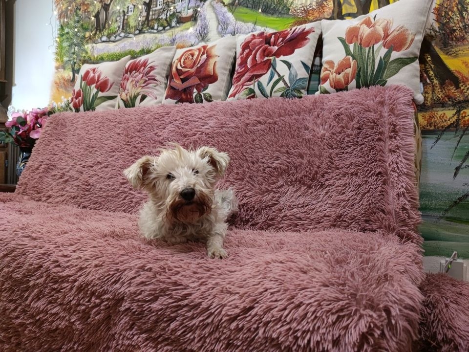 Odpočívá na gauči, sama si vyskočí. Už se nebojí. I kůže se jí hojí, ale to je na delší dobu.