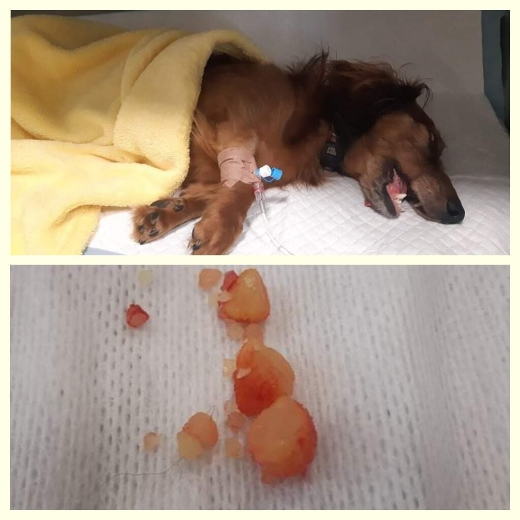 Jen připomenutí, je hermafrodit, má vývod a problémy měla v minulosti opakovaně. Nyní byl dlouho klid, s veterinární dietou jsme si mysleli, že bude cajk napořád, ale ne… Kameny jsme poslali na rozbor a uvidíme, z čeho jsou tentokrát. Vše zvládla bez komplikací. Je už doma a spinká. ❤