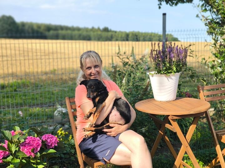Na fotce v náručí paní Reginky, která má s dcerou Anet v dočasné péči našeho Puclajse a adopci Jackie.