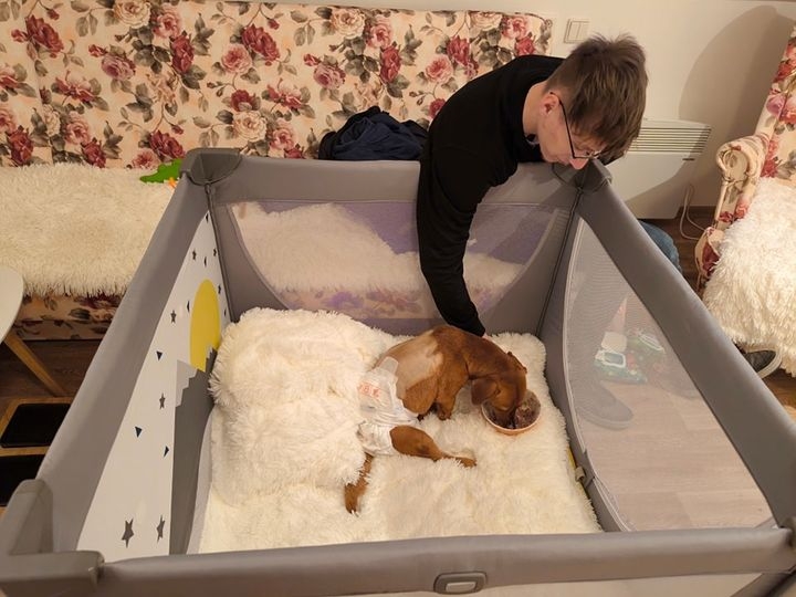Luky nám ho před pár okamžiky dovezl. Už se zabydlel. Šest týdnů ho čeká takové „vězení“ bez pohybu. Uvidíme, zda vydrží v postýlce, kdyžtak máme velkou klec.