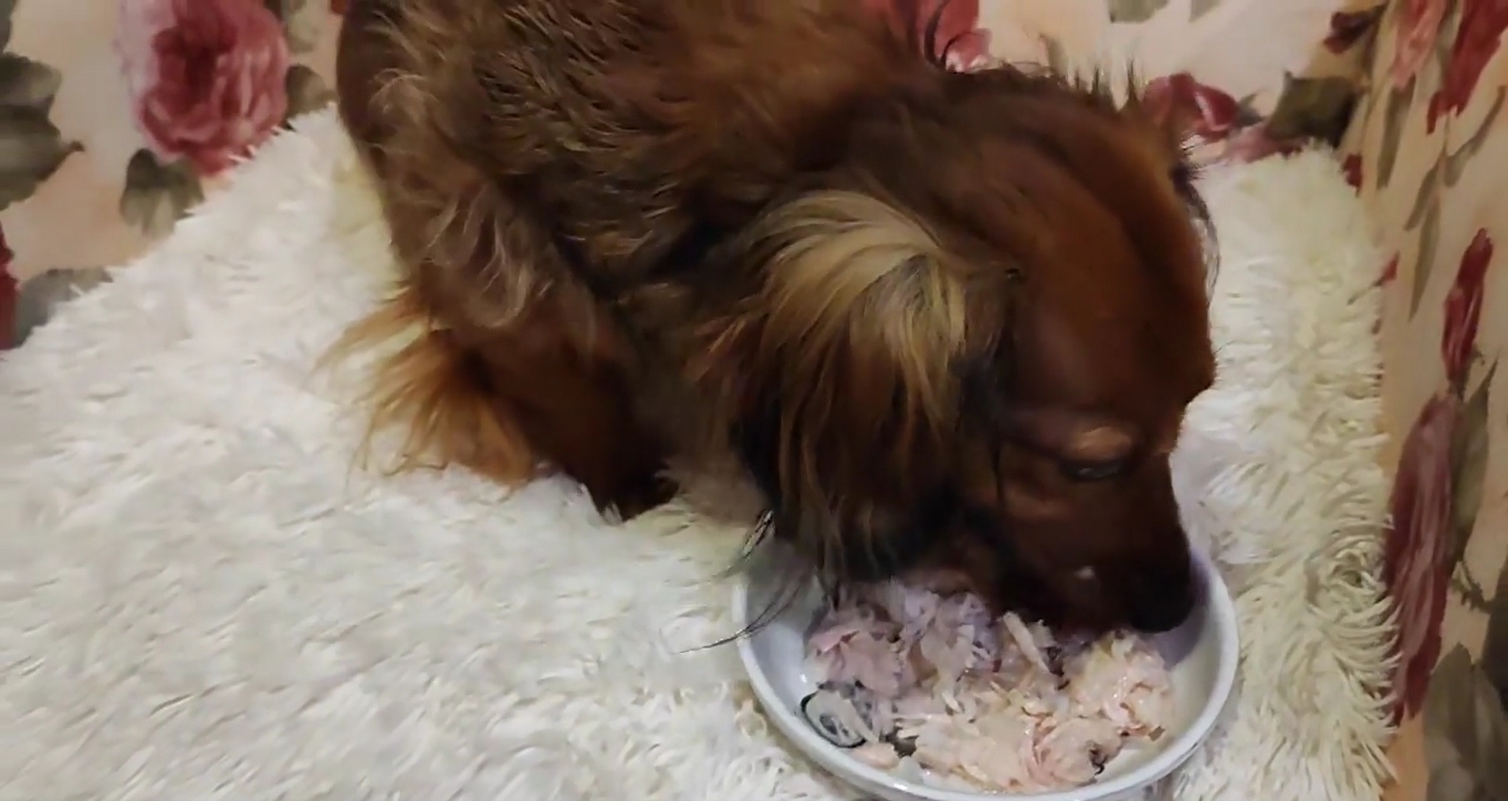 Mňam, mňam. Endouškovi moc chutná. A přední nohy fakt používá! Neuvěřitelné!