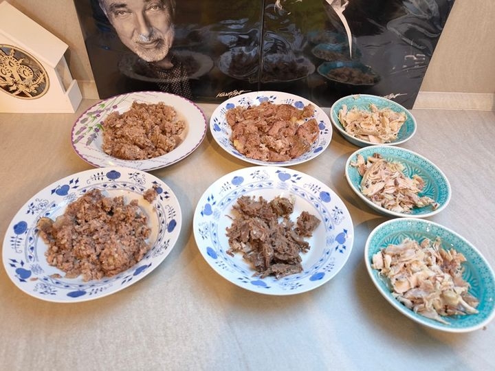 Kachní s rýží, jehněčí s bramborem, hovězí steak, kuřátko. Bohoušek, Tomášek, Sonička, Emilka, Kamilek, Belinka a Mikešek už se oblizují.