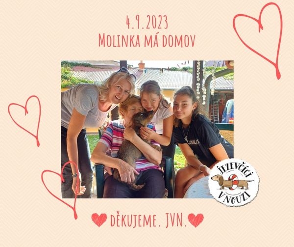 Přesně tyto zprávy píši nejraději. Když si duše k sobě najdou cestu, když k sobě patří. Pak jen zavřu oči a řeknu si, je to přesně tak, jak být má a cítím nesmírné štěstí. Rodina si Molinku zamilovala okamžitě, s úsměvem odpověděli na všechny naše dotazy a my tak přesně víme, že k sobě fakt patří. Molinko, buď šťastná a hooodně dlouho. Vám, kamarádi, moc děkujeme, že jsme společně dali naději na nový začátek jedné zlomené psí babičce. A rodině děkujeme za dokonalý domov.