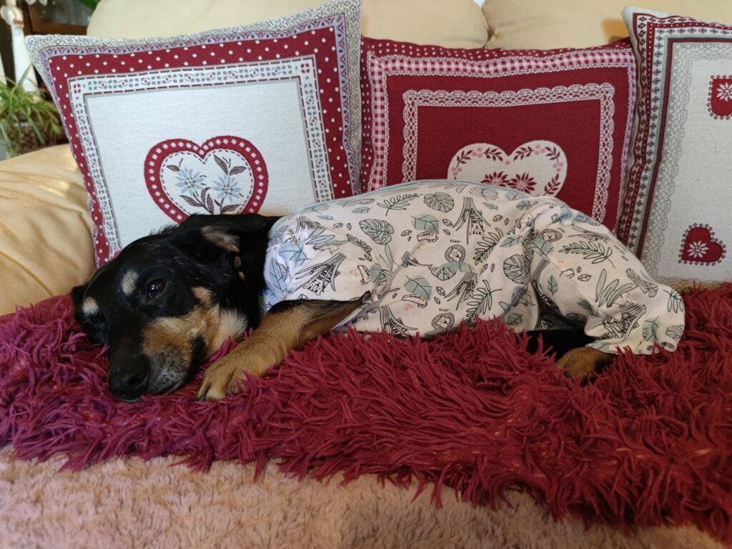 Mám u Ivoška velké mínus. A jeje. Musela jsem mu dát overal. Protože límec nesnese, zabil by tím všechny psy, jak mu děsně vadí. A bohužel si od rána chce furt lízat jizvu po kastraci. Takže….jak jinak. Lepší než ucpat prubanem. Overalům zdar. Snad to masíčko spraví a nebude se už zlobit.