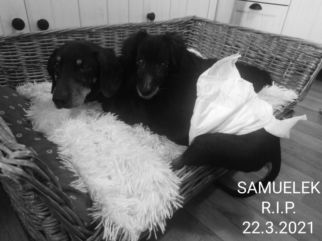 Hledala jsem fotku Samuelka, samotného. Nenašla. Mám stovky fotek, ale vždy s jeho láskou Mášenkou. Byli jedno tělo, jedna duše. Teď je Máša sama. Byl už tak starý, oslavil by 18.narozeniny. Jeho nemocné srdíčko dosloužilo a on v klidu usnul. Nebyla noc, kdy bych k němu nevstávala, i několikrát mě volal, že něco potřeboval, otočit, napít… Uměl to se mnou. Mluvil se mnou. Každý tón jeho hlasu jsem rozeznala, co zrovna teď chce. A teď…je ticho. Zvláštní ticho. Tolik jsme se těšili na jaro, zahradu, kterou tak miloval. On to věděl…včera chtěl být stále venku. Procházel se a loučil se. Hvězda v souhvězdí JVN svítí a bude nás provázet navždy. Děkuji ti Samko za společný čas.