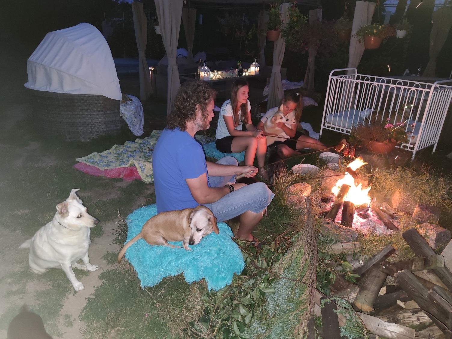 Pejsci, kteří nepadli ještě únavou, jsou s námi u ohně. Co by to bylo za prázdniny bez špekáčků ??