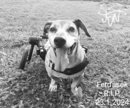louky, jak jsi to měl tolik rád, s úsměvem od ucha k uchu, dokonale šťastný…. nebudeš nadšeně objevovat na každé procházce vždy něco nového zajímavého, ty už teď běháš tam nahoře po jiných pláních….. Ani se nebudeš dál zdravit s kamarády pejsky i kočičkami, které jsi na svých cestách potkával, a ke kterým jsi byl tak přátelský a něžný, navzdory tvé stafordí povaze, která ti kolovala v krvi a která spolu s tím vším zlým, čím jsi si v životě prošel, než jsi se dostal do JVN, způsobovala i tvé náhlé zkraty ve smečce, kdy stačil nějaký rušivý podnět, jako zvonek pošťáka a tobě to v mozečku přeplo a začal jsi kolem sebe kousat, jakoby jsi chtěl zahnat vše to špatné, co tě v životě potkalo… Díky lásce, péči a klidnému zázemí, které jsi mohl mít jen sám pro sebe a přesto být dál v kontaktu s ostatními pejsky, i tyto běsy ze tvé dušičky postupně zmizely, a tak se z nepředvídatelného poďěsa stal velký kámoš dokonce i kočiček, ke kterým jsi byl tak pozorný a něžný, stejně jako ke svým lidem, které jsi zahrnoval obrovskou láskou, něhou a vděčností… Do JVN jsi se dostal před téměř pěti lety až ze Šumavy ochrnutý, podvyživený, kost a kůže, nemocný, celý bolavý a se spoustou ran na těle i dušičce, které se časem podařilo zahojit tak, že jsi si mohl nový život užívat plnými doušky. Bylo ti tehdy asi deset let a tak už jsi namísto dovádění s pyžamáčky s nimi raději jen tak polehával na sluníčku na zahradě a sledoval dění kolem, raději jsi aportoval míčky, hledal v trávě myšičky a vychutnával si dlouhé objevitelské výlety. Dal jsi se tak krásně dohromady a během těch téměř pěti let, co jsi si užíval života v JVN jsi neměl žádné vážnější zdravotní potíže. Srdíčko jako zvon, ani jsi netrpěl na infekce močáku, jak to často u pyžamáčků bývá, bral jsi jen doplňky, byl jsi ve výborné kondici. Až nedávno trochu horší jaterní výsledky- dostal jsi jaterní dietu, kterou jsi baštil se stejnou vervou a chutí jako vždy a se stejnou chutí jsi si dál užíval každičký okamžik života. Minulý týden preventivní prohlídka odhalila náhodou útvar na slezině. Nebylo na tobě nic znát, jen pár dnů jsi už na procházkách neběhal tak jako vždy, chodil jsi více s námahou- chtěli jsme řešit injekcemi Librelly pro tvé přeci jen již starší klouby. Plánovaná rutinní operace sleziny, na kterou jsi byl ve skvělé kondici a večer jsi měl být zase doma….a pak přišel ten šok…..při operaci vyšlo najevo, že nádory byly i na játrech….komplikovaná operace….dostal jsi naději….paní doktorka Zuzka se pokusila o nemožné a už se zdálo, že to zvládneš…. Játra však byla oslabená víc než se zdálo a tak jsi tiše ráno odešel….Do poslední chvíle jsi si užíval naplno života a nebyl sebemenší náznak, že by to s tebou mohlo být tak vážné….do poslední chvíle jsi si naplno vychutnával a užíval těch téměř pět let nového života v JVN a rozdával kolem sebe spoustu radosti, štěstí a úsměvů….píšu a přes slzy nevidím...Moc ti Ferďásku za ten krásný čas, který jsme spolu mohli tolik šťastní prožít, děkujeme….Z našich srdcí nezmizíš nikdy….pozdravuj tam nahoře... v souhvězdí JVN budeš ode dneška zářit jako další jasná hvězdička…."