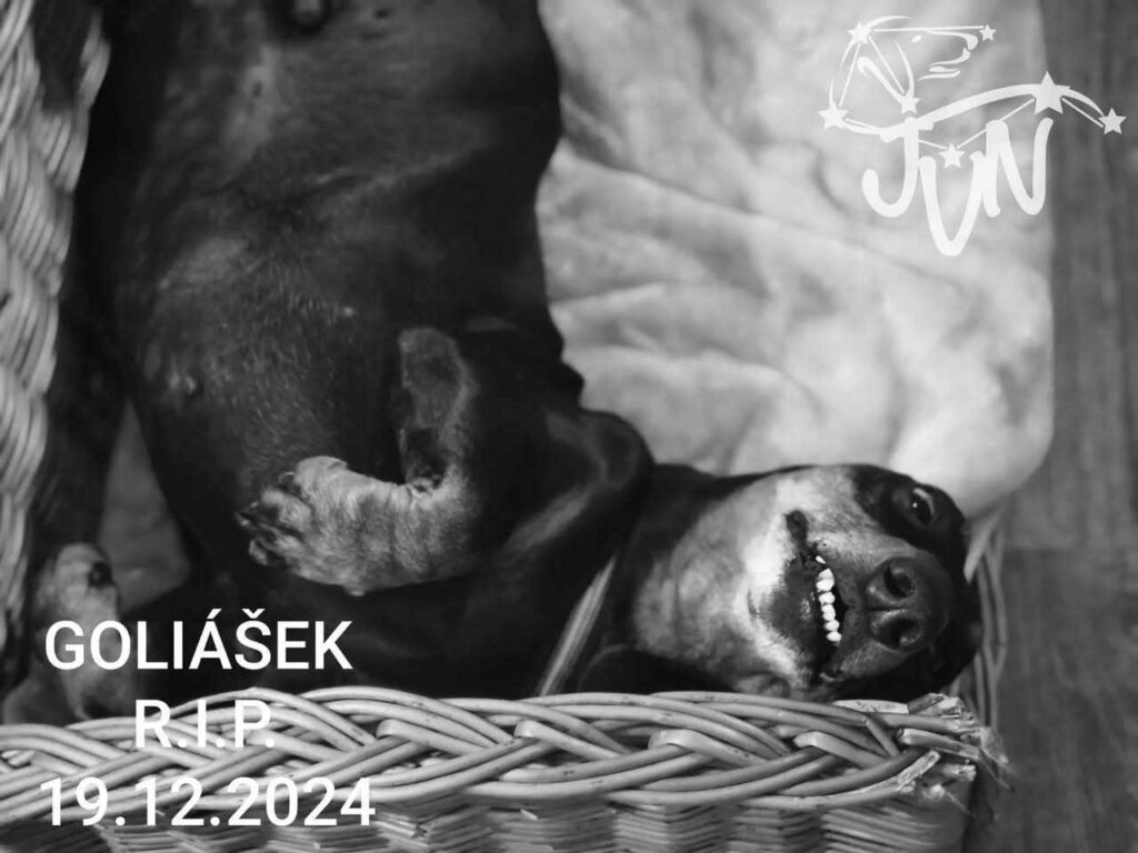 se a byl úplně cajk. Miloval sluníčko a teploučko. Takže v létě od rána na lehátku a teď v zimě u krbu s pupíkem nahoru. To byly jeho nejčastější polohy. Nohy nahoru, úsměv. A jedním očkem pozoroval cvrkot. Byl nesmírně dobrý a hodný, byl svůj, hrdý pan pes. U léků byl vždy jako první. Stál mi pod nohami, jeho dlouhý čumák nahoru a jemně mě do kolena ťukal - jsem tady. Jako hodinky. Ráno, večer. Vždy ten dupot...běžel, jak se těšil na léky. Dostal tabletky a šel si lehnout. Takový rituál. Jídlo slupl za vteřinu. Když včera večer nepřišel na léky, tak už jsem věděla, že je něco divné. Hned ráno frčel a ....Ještě ráno jsem se paní doktorky ptala, zda bude ok, že prý chce lovit kočku, bude cajk....a pak pár hodin a cajk to sakra není. Goliášek teď už září v Souhvězdí JVN. Včera jsem v jedné mé odpovědi psala, že žijeme tak, jako by den byl ten poslední...nikdy nikdo nevíme, kdy nám ten plamínek života zhasne, zavane vítr a je konec.Goliášku, děkujeme za společný čas. Kéž to Davídek bez tebe zvládne. Děkujeme vám všem za podporu.