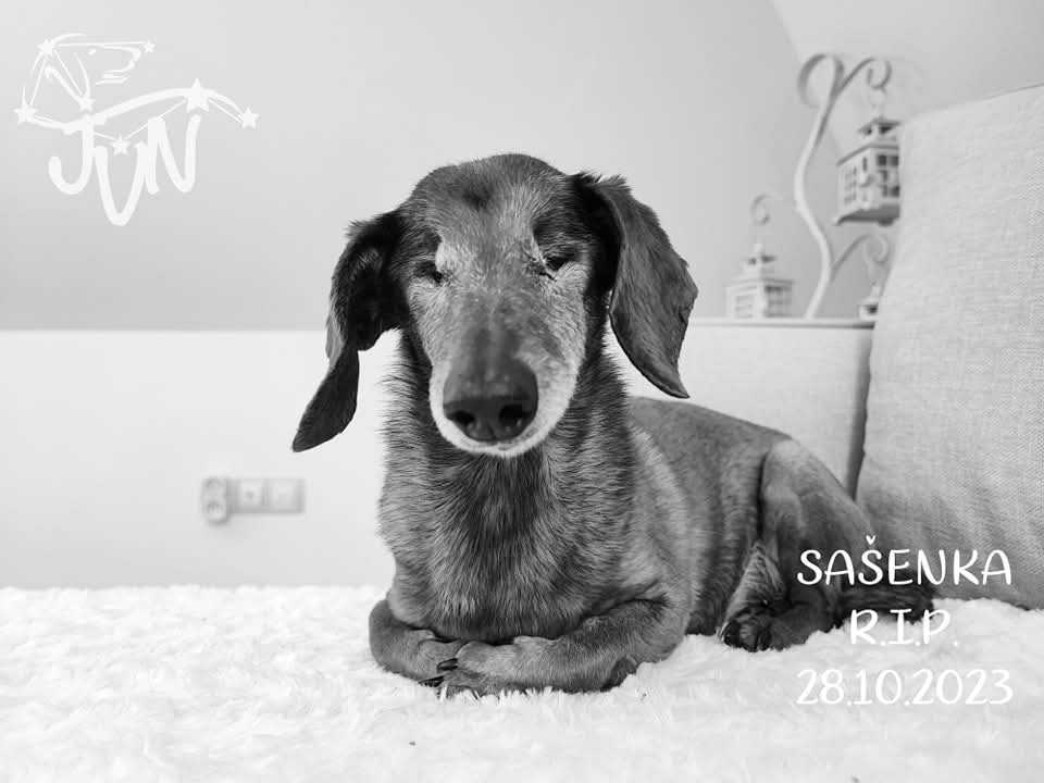 chudák! Sebevědomě jsi chodila na Psích dnech s úsměvem a každý tě mohl jen obdivovat. Jídlo! Panečku! Jak jsi neměla do sedmé ranní snídani, tak to bylo řevu! A když k nám přijela mamka a dovezla ti špekáček, šmarja, to byly točky, jak centrifuga. Žila jsi do posledního dne s úsměvem. Ano, byla jsi kardiak, měla jsi cushing, ale nic tě netrápilo. Až do včerejší noci, kdy jsi měla příhodu, tu, kterou my známe, která staroušky potkává a my pak věříme, že to mozek dá...snažila ses, opět jsi bojovala, ale....dnes ve tři hodiny ráno jsi usnula. Co já bych dala za další roky s tebou, vše co mám. Cítím vztek nad všemi těmi jinými, kteří jen tak opustí své lásky. Sašenko, děkuji ti za krásných 7,5 roku. Byla to kolikrát jízda, když jsem byla jen trošku smutná, vzala tě do náručí a zabořila nos do tvého kožíšku, hned bylo lépe. Sašenko, jsi teď v souhvězdí JVN a dnes ti patří nebe. V mém srdci budeš navždy. Dyckyyy Čučmeeeeen! Nic není samozřejmostí, nic. To jsi mě naučila.